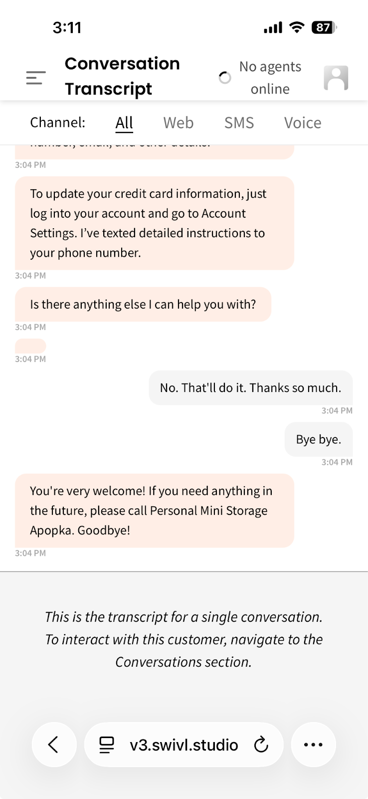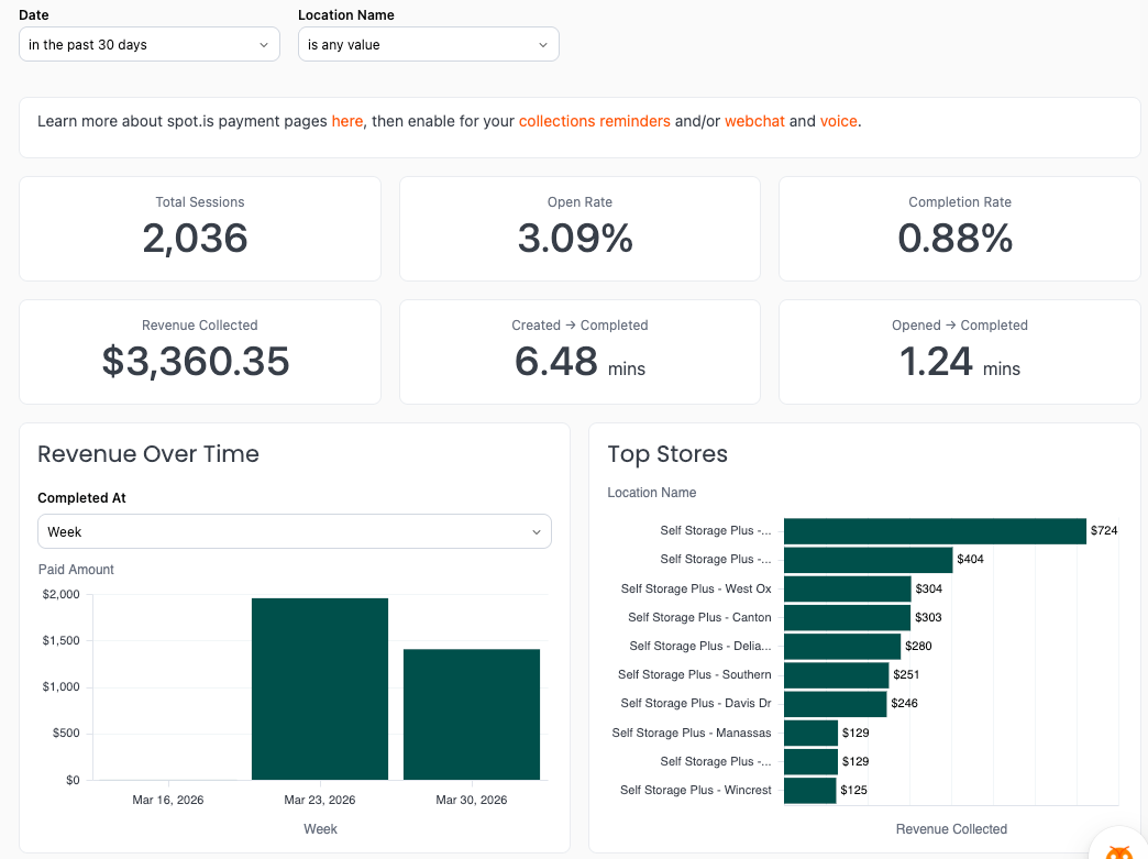 This brings Sitelink and SSM in line with StorEdge, which already supported payments through spot.is. When a tenant has an outstanding balance, your bot can generate and send a payment link on the spot - across webchat, SMS, or voice.