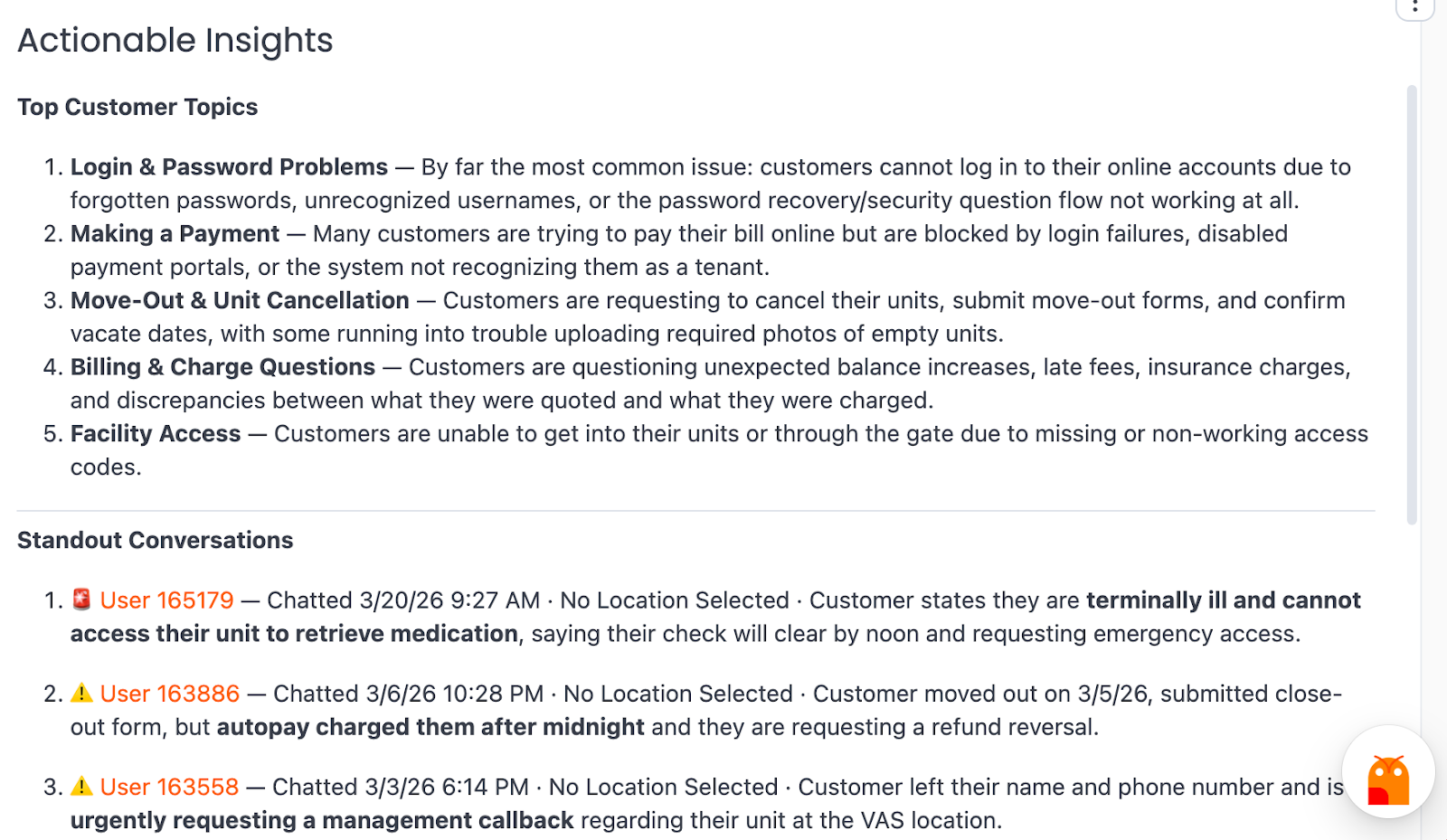 Actionable Insights surface conversations worth your attention, flagging interactions that could use a follow-up or review alongside standout positive exchanges. No more scrolling through raw data to find what matters.